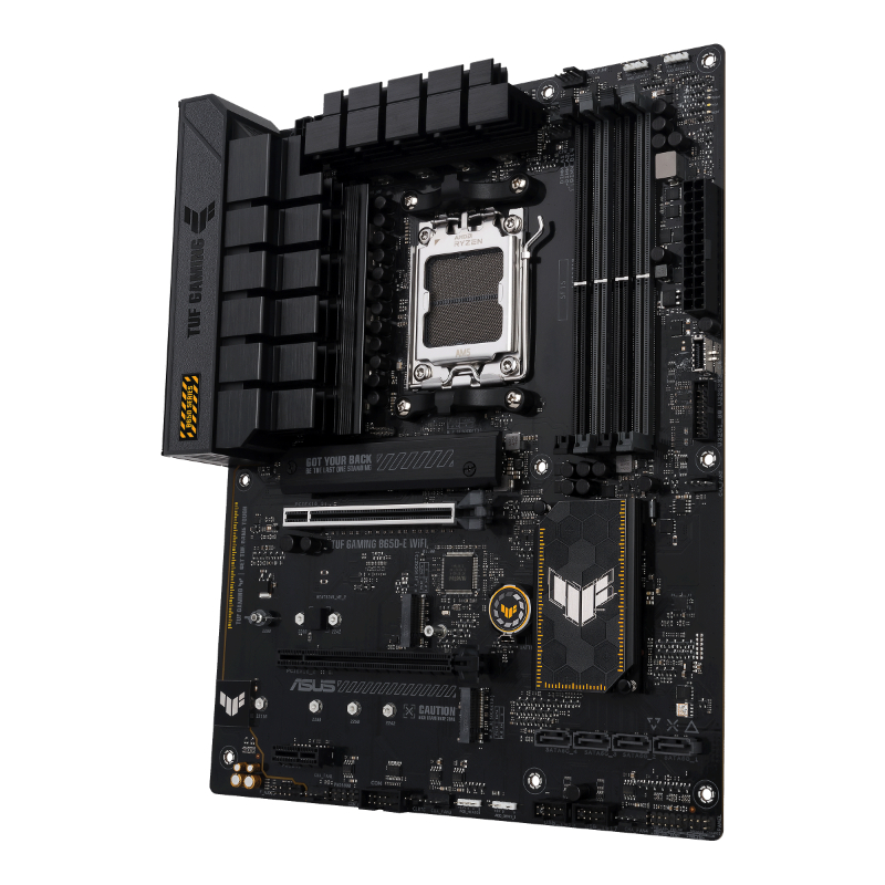 ASUS TUF GAMING B650-E WIFI toma todos los elementos esenciales del último zócalo AM5 para procesadores de sobremesa AMD Ryzen™ y los combina con funciones listas para jugar y una durabilidad probada. Diseñada con componentes de grado militar, una solución de alimentación mejorada y un completo sistema de refrigeración, esta placa base supera las expectativas con un rendimiento sólido como una roca y estable para juegos maratonianos. Las placas base TUF GAMING también se someten a rigurosas pruebas de resistencia para garantizar que pueden soportar condiciones en las que otras podrían fallar. Estéticamente, este modelo incorpora resistentes elementos de diseño geométrico y negro apagado para reflejar la fiabilidad y estabilidad que definen a la serie TUF GAMING.