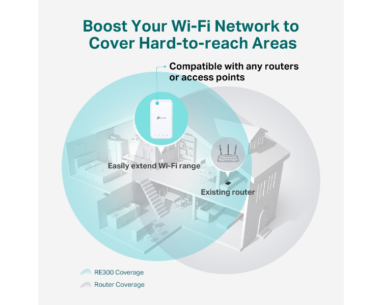 RE300 se conecta inalámbricamente al router Wi-Fi, fortalece y amplia su señal en zonas donde por sí mismo no puede llegar. Con velocidades de hasta 300 Mbps en 2,4 GHz y 867 Mbps a 5 GHz * 1, con potente y rápida conexión Wi-Fi en cada habitación para decir adiós a zonas muertas.