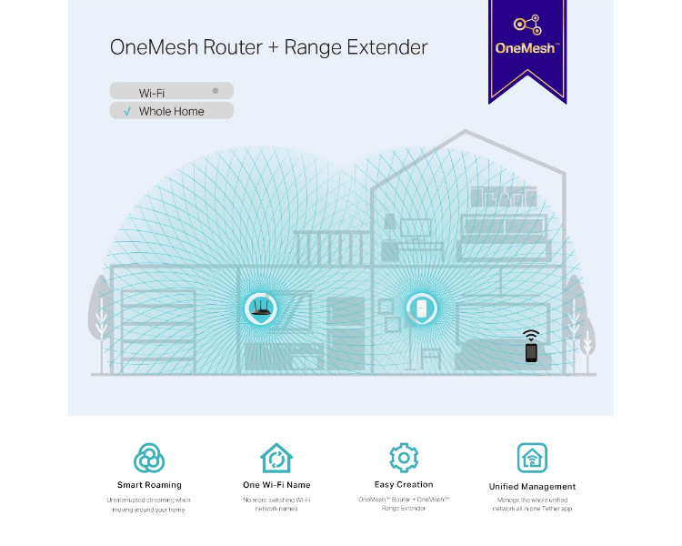 ¿Quieres una red Mesh? Actualiza el firmware de tu Router TP-LINK a la versión OneMesh. y adquiere dispositivos de Extensión de Cobertura Wi-Fi OneMesh, de TP-Link.